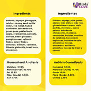 Some of the ingredients are banana, papaya, raisins, millet, peanuts, cranberries, carrots, pumpkin seed, spinach flakes, almonds, walnuts, cashews, Brazil nuts, sweet potatoes and much more!